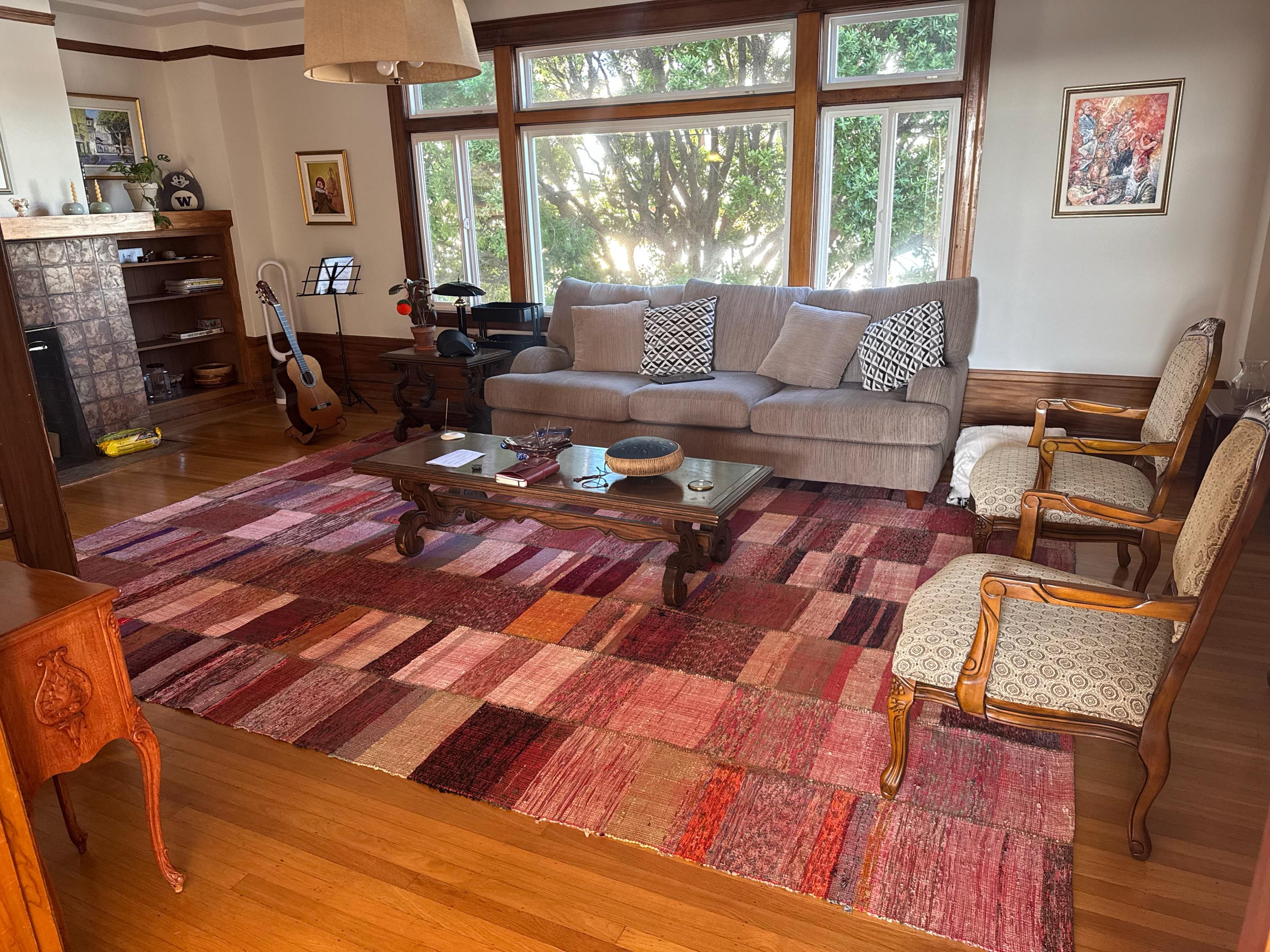 This oversized Turkish Kilim showcases the timeless artistry of Anatolian village weaving. Its hand-spun cotton and naturally dyed tones provide durability, breathability, and understated elegance, making it ideal for modern, boho, or Scandinavian interiors.